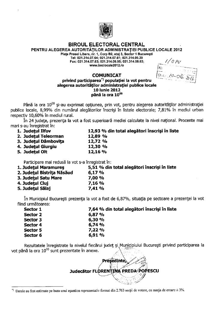 Prezenţa la vot pe ţară la scrutinul parlamentar de astăzi a fost, până la ora 12.00, de 10,69% respectiv de 1.945.354 de alegători, potrivit datelor anunţate de biroul electoral central (bec). Romanul e lenes la vot si lenea asta e mai eficienta decat orice boicot constient organizat.