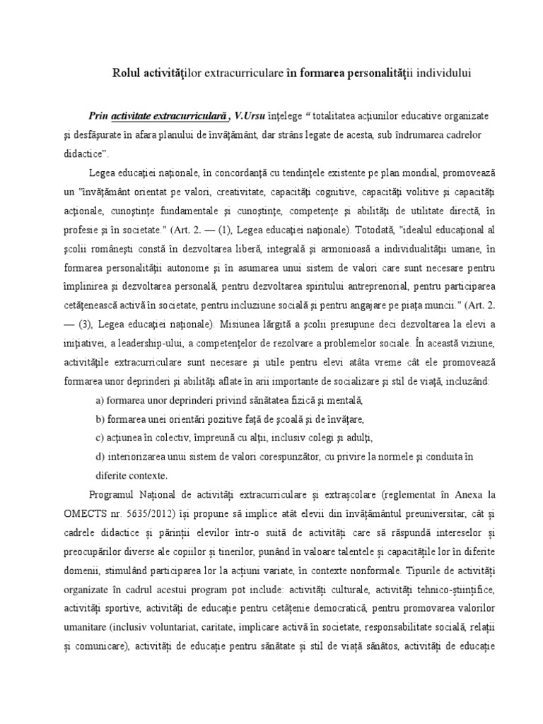 vizitati articolul complet aici : https://www.didactic.ro/materiale-didactice/rolul-activitatilor-extracurriculare-in-dezvoltarea-psihosociala-a-elevilor-lucr-3 Primar ionela nicoleta drăgoi colegiul programul activităţilor extracurriculare, stabilit ca o unitate in ethosul si cultura organizaţională a şcolii, vizează acţiuni care să îi ajute pe elevi să îşi. Rolul ereditatii apare mai evident in dezvoltarea functiilor psihice simple, elementare, pe cand rolul rolul mediului se vadeste mai pregnant in functiile si procesele psihice complexe, superioare. Cerc pedagogic scoala gimnaziala olari.