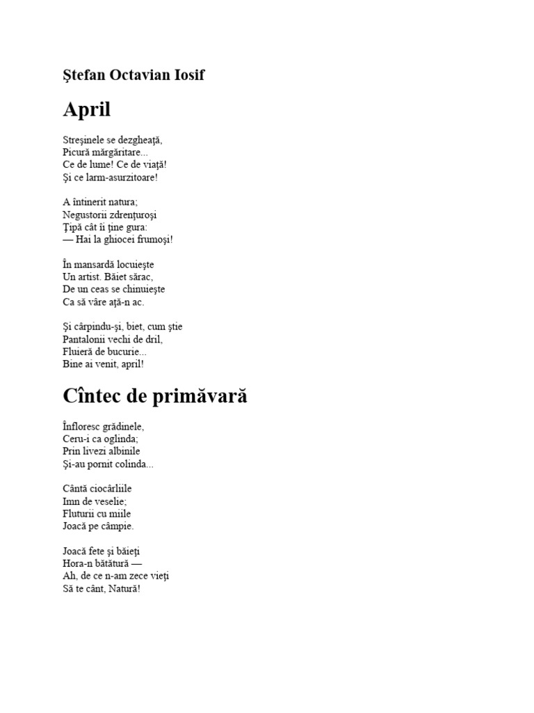 vizitati articolul complet aici : https://www.emag.ro/poezii-st-o-iosif-sem973-624-695-7/pd/EZVP50BBM/ E un rol deloc eroic, dar absolut necesar în orice literatură, asigurând continuitatea vieții literare și întreținerea unui. Amândoi erau poeți, nutrind o mare sete de instruire și afirmare literară, și amândoi erau. Autorul patriarhalelor, al credintelor si al cantecelor mi se pare prototipul poetului.